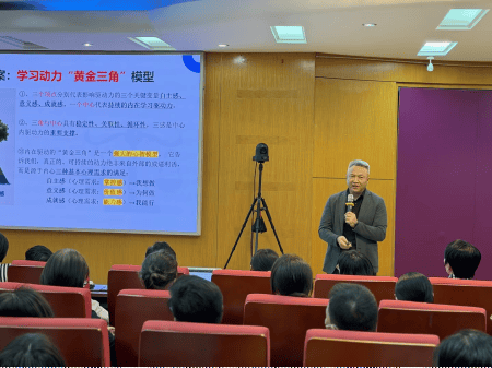 在核心分享环节中,马老师从“作业战场”“学习无用论”等常见痛点切入,指出孩子学习动力不足的核心是“内在驱动系统失衡”。他引用著名家庭教育专家王文华老师在《学习动力金三角》中的理论指出,可持续学习动力源于“自主感、意义感、成就感”三大心理需求,这三大需求共同构成了“学习动力金三角”。