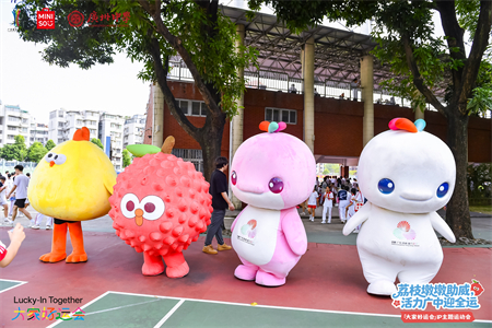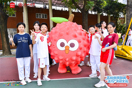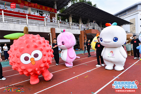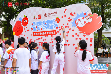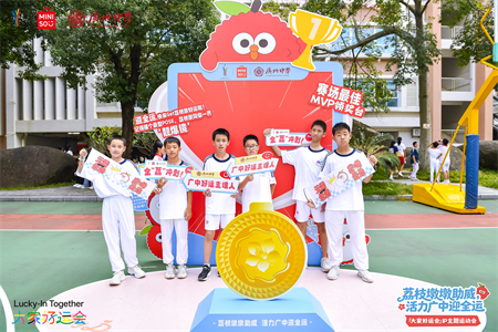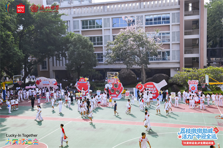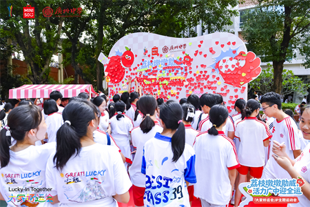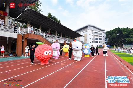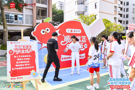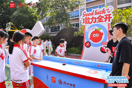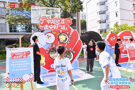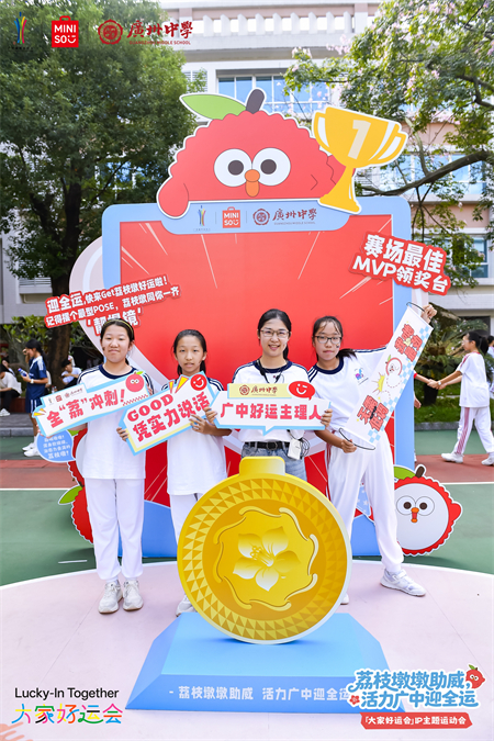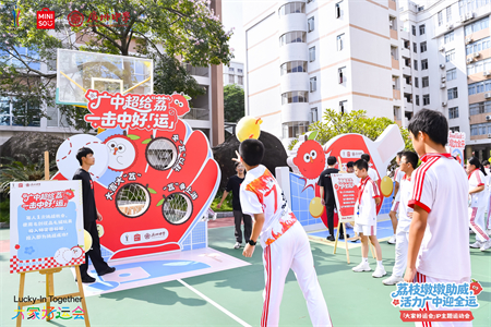 开幕式结束后在篮球场同步开展四大IP主题趣味赛事:“广中超给‘荔’”环节,学生投掷印有名创优品IP元素的毛绒玩具,在运动中感受岭南文化;“顺顺荔荔乒全运”设置迷你乒乓球挑战,传递国球魅力;“赛场最佳MVP领奖台”前,创意拍照框吸引学生记录拼搏时刻“good luck! up up up!墩力全开”区域则借助冰壶道具,让学生体验冰雪运动的乐趣。此外,现场特设“荔枝墩墩留言区”,两千张便利贴写满学子对十五运的祝福,展现青年一代的担当与热情。